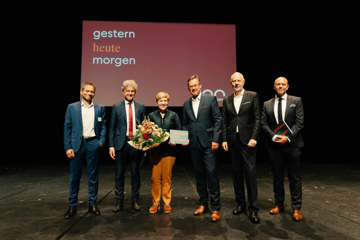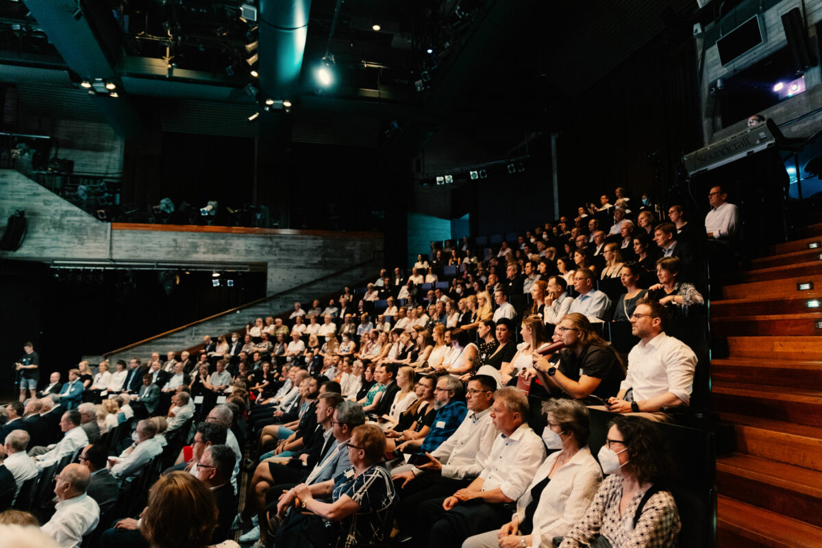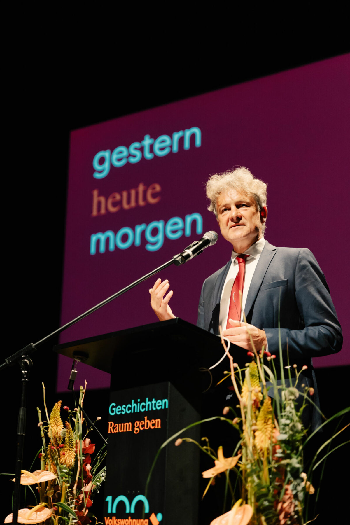 Mit der Kernfrage des frühen Bauhauses „Wie wollen wir leben?“ beschäftigten sich die verschiedenen Rednerinnen und Redner des Abends, darunter der Trend- und Zukunftsforscher Matthias Horx, Nicole Razavi, baden-württembergische Ministerin für Landesentwicklung und Wohnen, und Axel Gedaschko, Präsident des GdW – Bundesverbandes deutscher Wohnungs- und Immobilienunternehmen. Oberbürgermeister Dr. Frank Mentrup begrüßte die Gäste und gratulierte als Karlsruher Stadtoberhaupt. Bürgermeister Daniel Fluhrer stellte in einem moderierten Gespräch mit Stefan Storz, Geschäftsführer der Volkswohnung, heraus, wie stark die Fächerstadt von der Tätigkeit der Volkswohnung geprägt wurde.